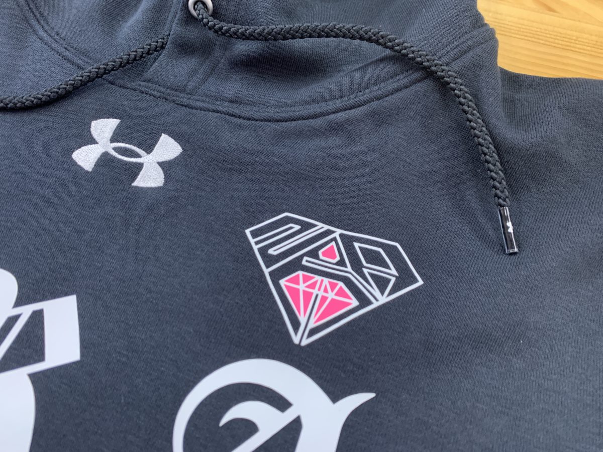 左胸のロゴは白とピンクの2色で仕上げております。細かなデザインですが綺麗に仕上げることができました!おしゃれですね!