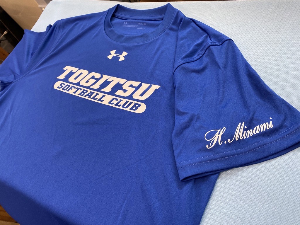 アンダーアーマーのTシャツにマーキングしました。ロイヤルのTシャツにシルバープリント相性いいですね!